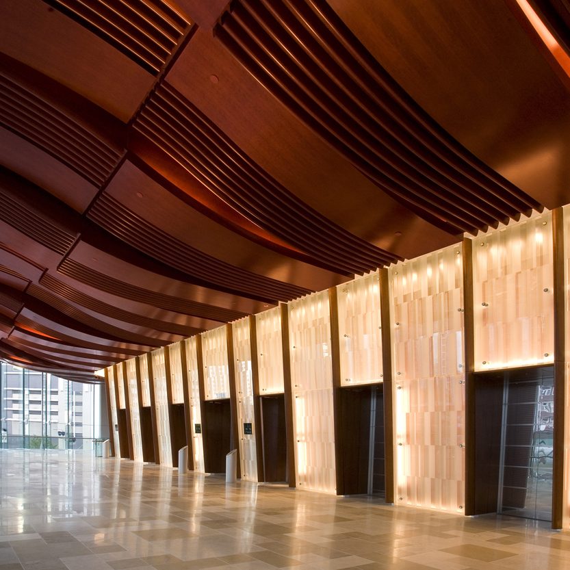 The exterior finishes for Lincoln House are clear anodized aluminium cladding with high performance, solar reflective, heat absorbing glazing. The ground and first floor lobbies are finished in anodized aluminium panels with granite flooring. There are seven high-speed lifts in two operating zones servicing the tenant floors. The lobbies feature permanent exclusively commissioned glass sculptures integrated within the design of the building.